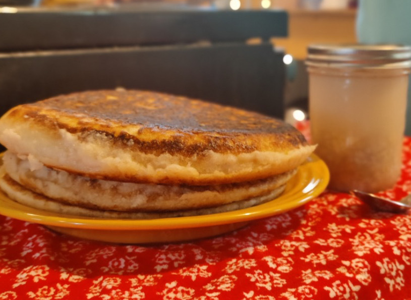 - To cook, heat a skillet over medium heat and coat it with oil. Pour about 3 large cups or spoonfuls of the batter into the skillet, spreading it evenly. Cover and cook for 5 to 8 minutes, or until the edges appear cooked, there are fewer bubbles on top, and the edges lift up, similar to cooking a pancake. Before flipping, drizzle a spoonful of oil on top, creating circles to prevent sticking. Flip and cook for an additional 5 to 8 minutes.