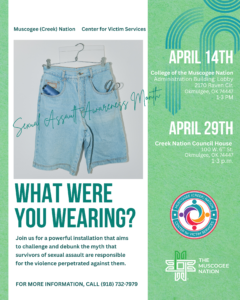 The Muscogee (Creek) Nation Center for Victim Services is holding an installation that will challenge and debunk the myth that sexual assault survivors are responsible for the violence perpetrated against them. It will take place on Wednesday, April 29, at the Creek Nation Council House from 1 p.m. – 3 p.m.