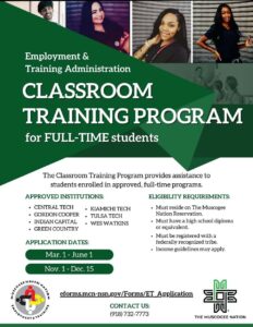 The Classroom Training Program is now open for full-time students enrolled in approved institutions. Students must be a citizen of a federally-recognized Tribe and must reside on the Mvskoke Reservation. Applications are open from Sunday March 1 through Monday, June 1.