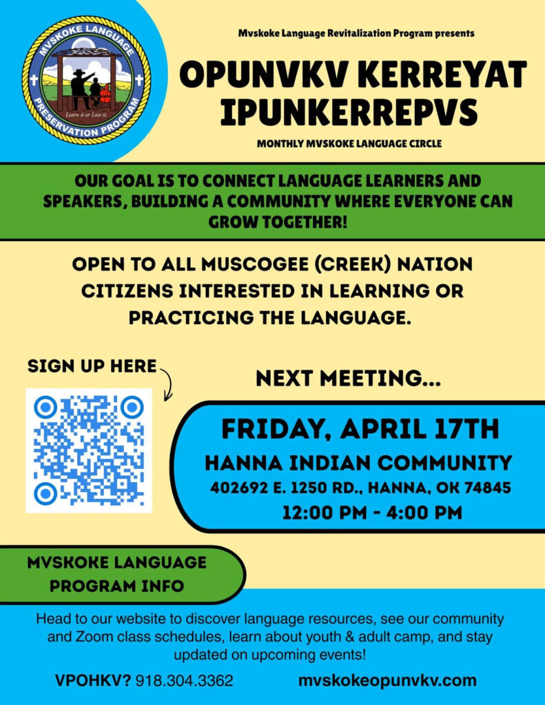The Mvskoke Language Program’s Monthly Language Circle meets at the Hanna Indian Community in Hanna from 12-4 P.M on April 17.
