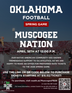 Preferred rate tickets will be available for the 2026 Oklahoma Football Spring Game. Use the link below to purchase tickets starting at $15.02. To purchase, visit ouath.at/MuscogeeFB26, or scan the QR code below.