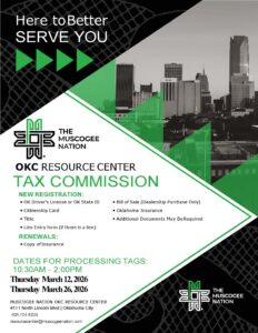 The MCN Tax Commission will be at the OKC Resource Center on Thursday, March 26. They will offer tag renewals from 10 a.m. – 2:00 p.m.