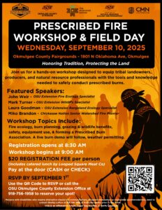 OKMULGEE – On September 10, a prescribed fire workshop and field day is taking place at the Okmulgee County Fairgrounds. During the workshop discussions will cover fire ecology, burn planning, grazing and wildlife benefits, safety, equipment use, and how to form a Prescribed Burn Association.