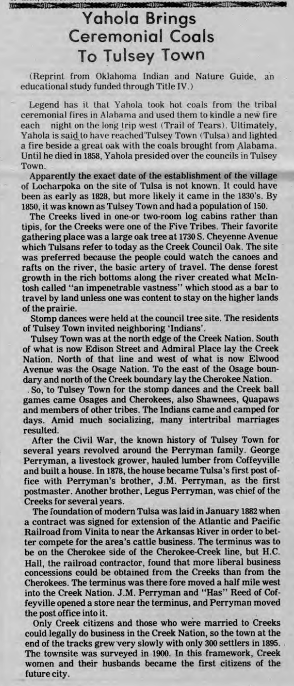 The parks hold huge significance to both the Nation and the city. The site is the first Mvskoke settlement within the region that became Tulsa: the Mvskoke people Locv Pokv Tvlse placed the embers of their sacred fire, carried from the ancestral homelands in Alabama, under the oak in 1836. As referenced in the MOU, this site is where they reestablished their Etvlwv (tribal town), Cuko Rakko (ceremonial ground), played stickball games, and held commerce and trade. The parks are listed in the National Register of Historic Places and in the Oklahoma Landmarks inventory.