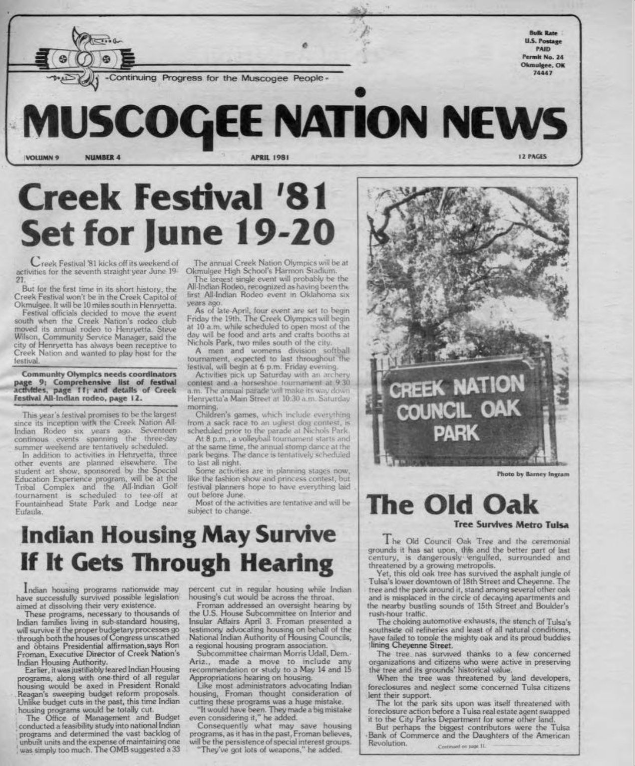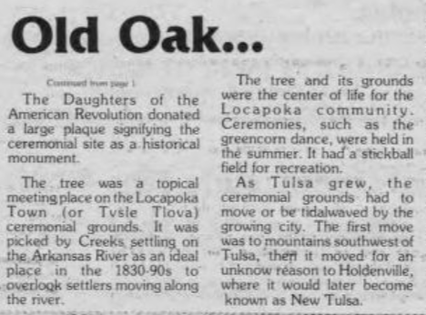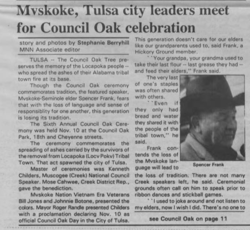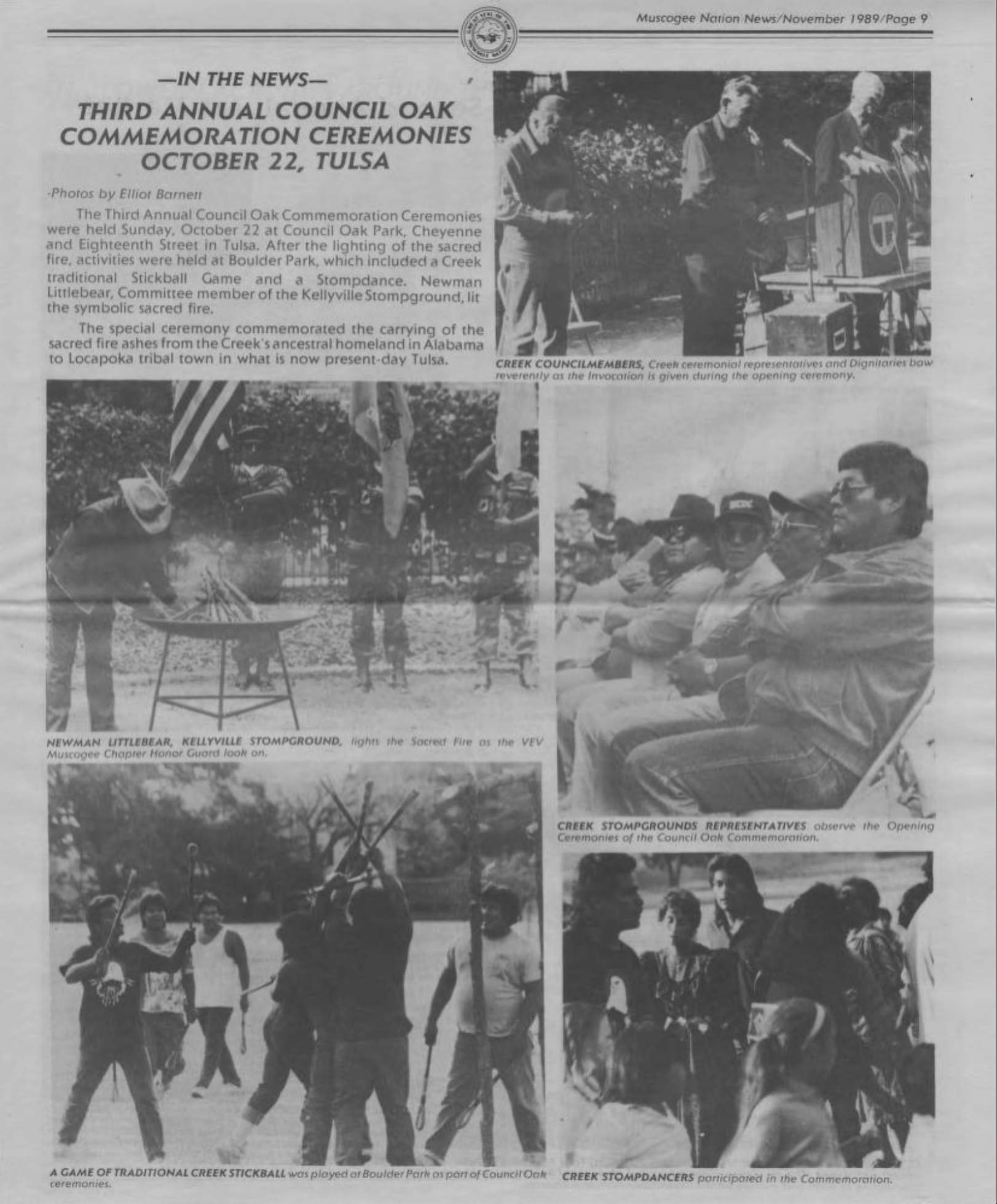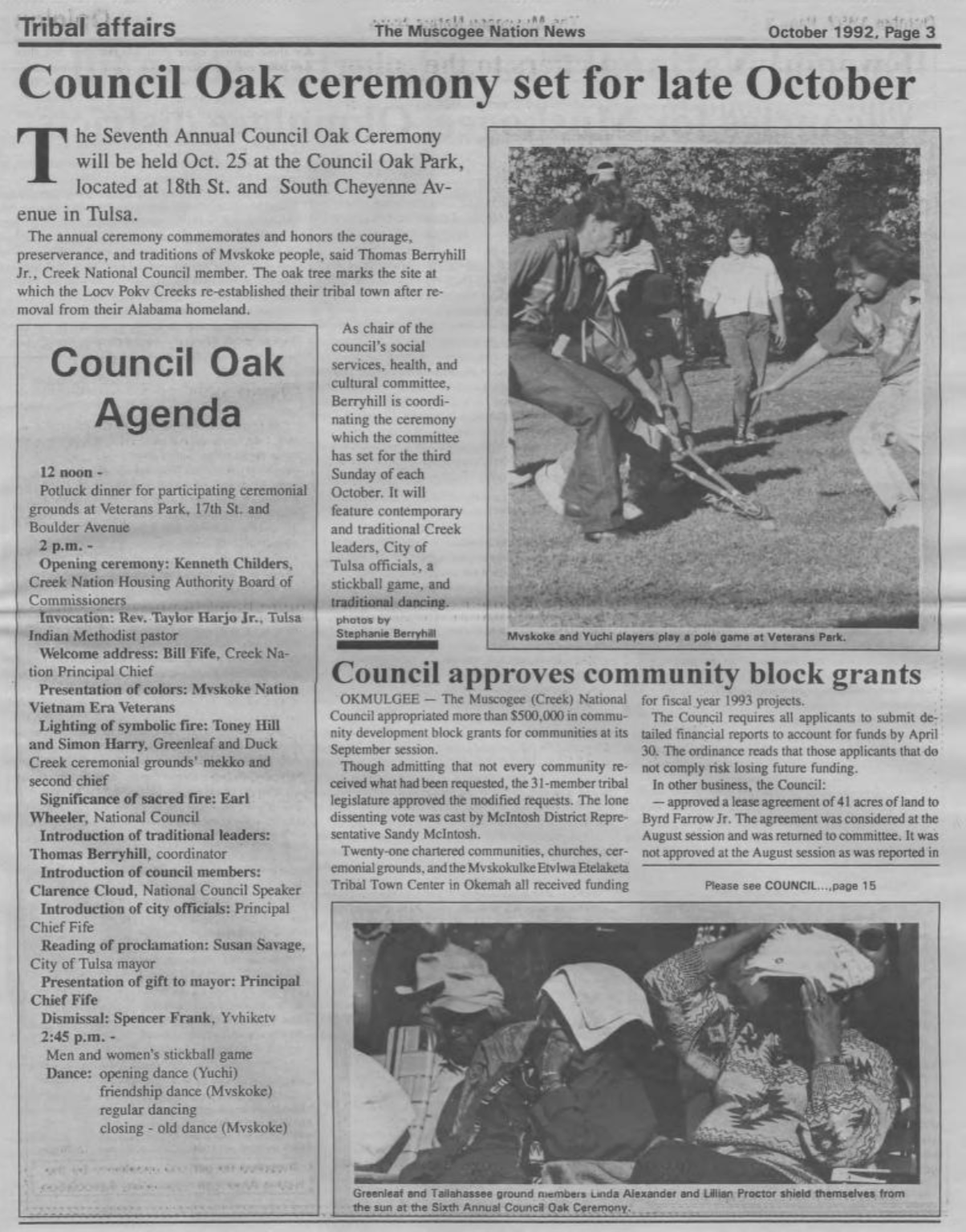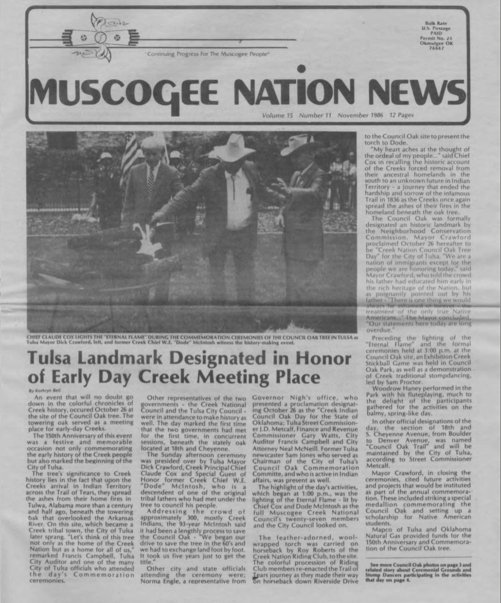 Both Council Oak Park and Stickball Park have been owned by the City of Tulsa: Stickball Park since 1946 and Council Oak Park since 1974. The MCN held the first Council Oak Day ceremony at the park on Oct. 26, 1986, under the leadership of Principal Chief Claude Cox. As reported in the Muscogee Nation News, then 93-years old former Principal Chief W.E. Dode McIntosh shared that work with the city to save the tree from development began 20 years prior: “We began our drive to save the tree in the 60’s, and we had to exchange land foot by foot. It took us five years just to get the title.”
