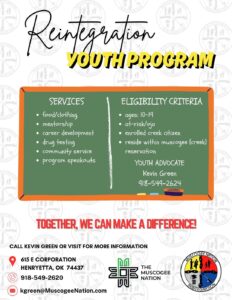 MVSKOKE RESERVATION – The Muscogee (Creek) Nation Reintegration Program (RiP) currently offers a specialized program for youth aged 10-19 years who are justice involved or at risk. The services they provide are designed to lead young citizens to a better path.