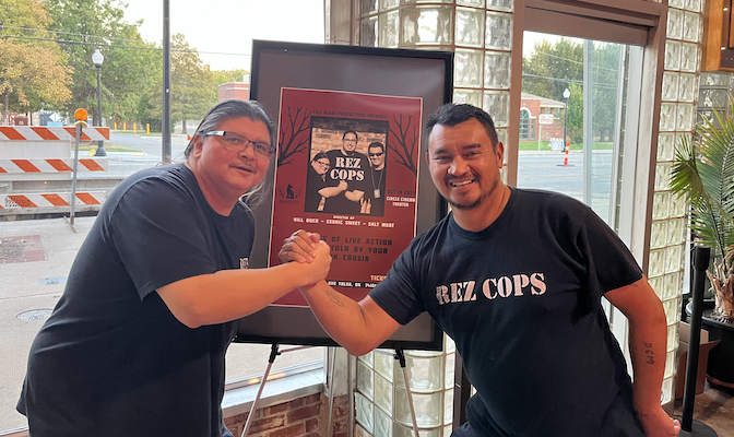 MVSKOKE RESERVATION- A new season of the show “Rez Cops” is in the works. The online show, available on Facebook, stars Eric Yahola (Mvskoke) and Will Buck (Mvskoke/Seminole) as Salt Meat and Saucie, and is produced by Justin McLemore and Blood Productions.