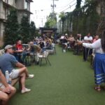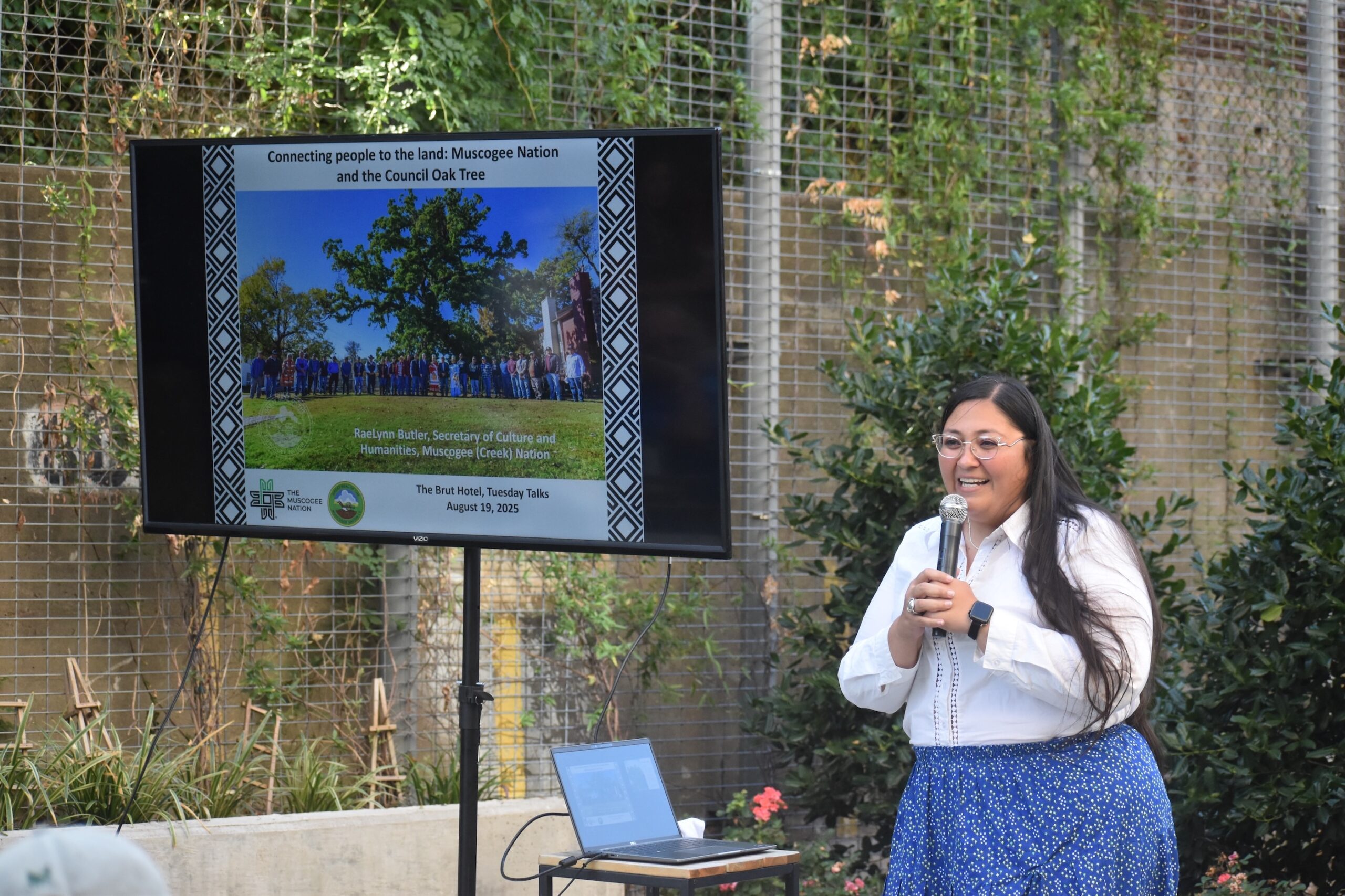 TULSA – A small crowd gathered on a hot evening to hear stories from Mvskoke history in the backyard lot of the Brut Hotel, located across Boulder Avenue from Dream Keepers Park in Tulsa on Aug. 19.