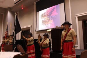 Kiowa Tribe Veterans Director LaRue Guoladdle (Kiowa) was one of the summit’s featured speakers. She is an army veteran who served from 1989-1996. She returned in 2015 before her retirement from the reserves. She was stationed in Germany during Operation Desert Shield and Operation Desert Storm. She is a proud member of the Kiowa Women Warriors color guard. At the summit, she wore a red Kiowa dress adorned with her army unit patches. Like other veterans Culley has encountered in the community, Guoladdle experienced inner self conflict stepping into a leadership role within her tribe.